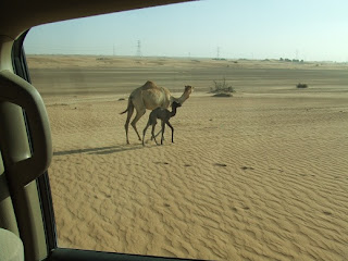 We were picked up from our hotel, the Movenpick Bur Dubai at around 3:30 in the afternoon my a man who introduced himself to us as "Gul" (rhymes with school). From there headed to downtown to Dubai to pick another pair of safari-goers, two Japanese ladies with almost no English, at their hotel. From there we immediately pointed the SUV out towards the desert. Did I mention it was the Arabian Desert? At first it looked like west Texas to me, but I guess all deserts look a little bit alike.